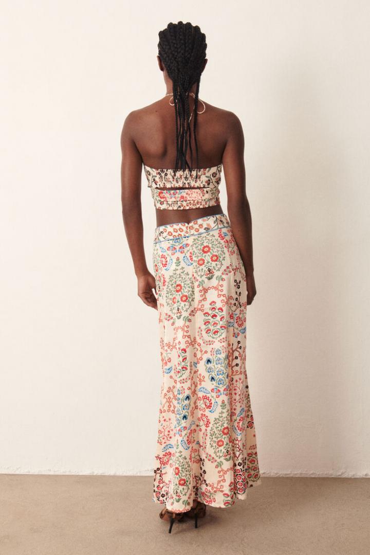 Description description  La jupe GARANCE ba&sh se veut estivale et féminine. Cette jupe fluide séduit par son imprimé coloré associant des motifs floraux originaux. Elle dispose d’un empiècement à la tail…