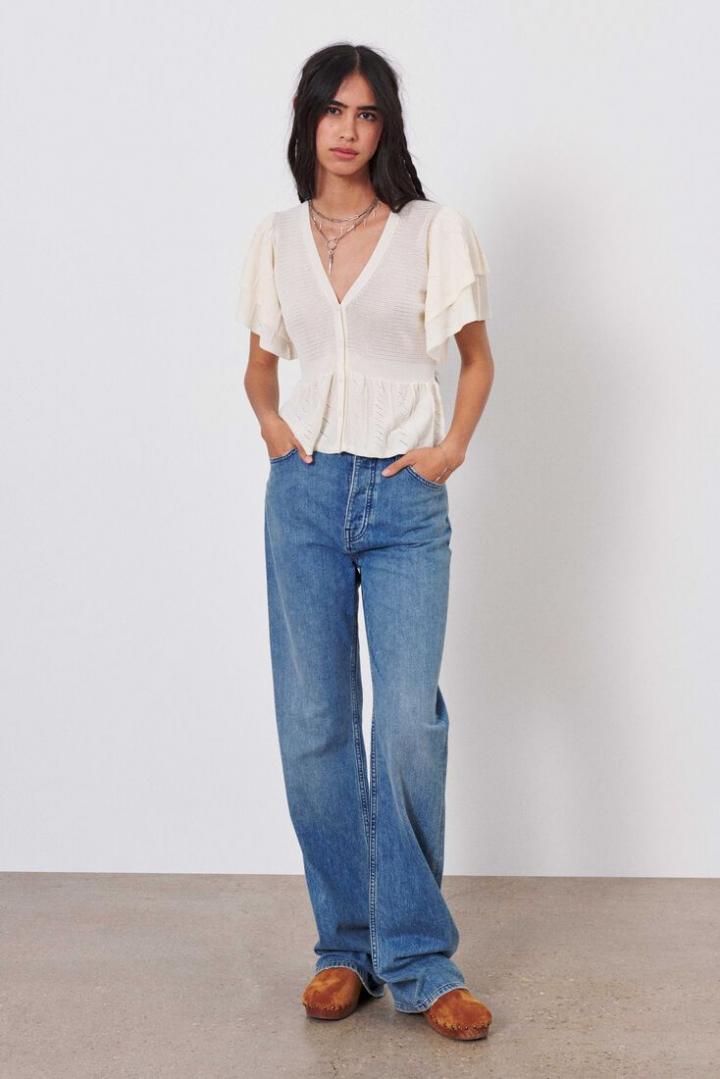 description Le gilet ACACIO ba&sh affiche une allure féminine ultra-séduisante. Ce gilet à encolure en V se distingue par sa double manche volantée avec jeux de pointelle et sa forme basque en bas. Il est confectionné dans un fil très fin, associant une maille légèrement ajourée sur le haut, une côte 1×1 à la taille pour resserrer le tricot et des jeux de pointelle sur la basque. A noter : les petits boutons ton sur ton. Un petit gilet féminin, très léger, parfait sur un jean pour une silhouette actuelle et délicate.