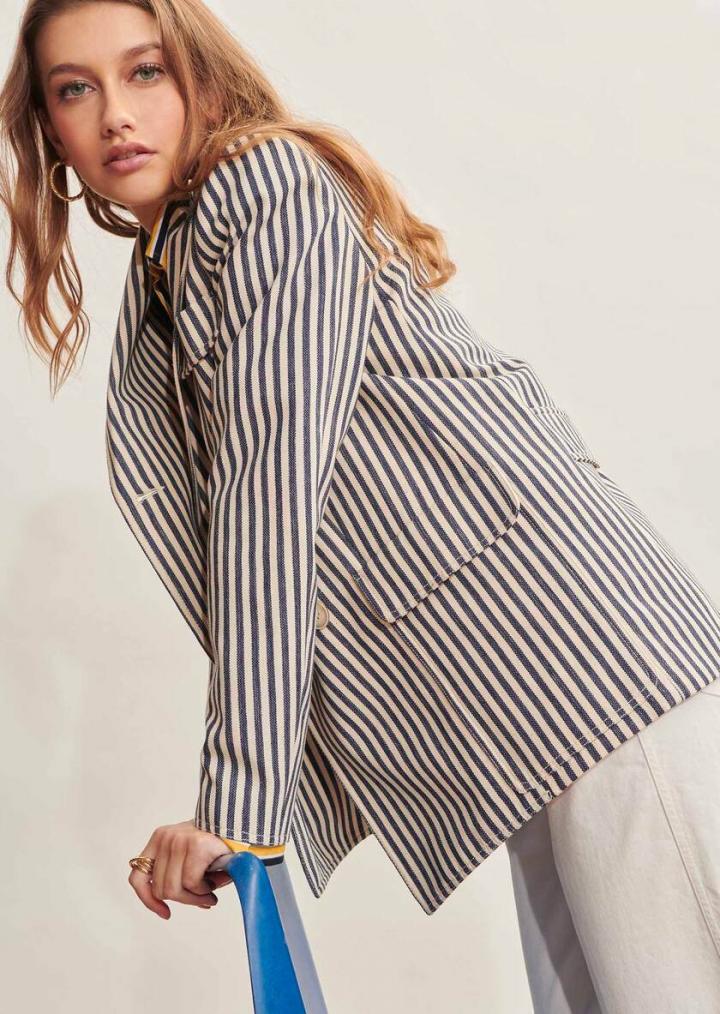 Cette veste écrue rayée bleu en coton se boutonne par un double boutonnage de boutons blancs. Elle possède 2 grandes poches plaquées à rabat ainsi qu’une martingale au dos. Idéale pour la mi-saison sur une chemise, on la porte avec le pantalon Patti assorti.doublure:100% viscose /87% coton 9% viscose 4% polyester
