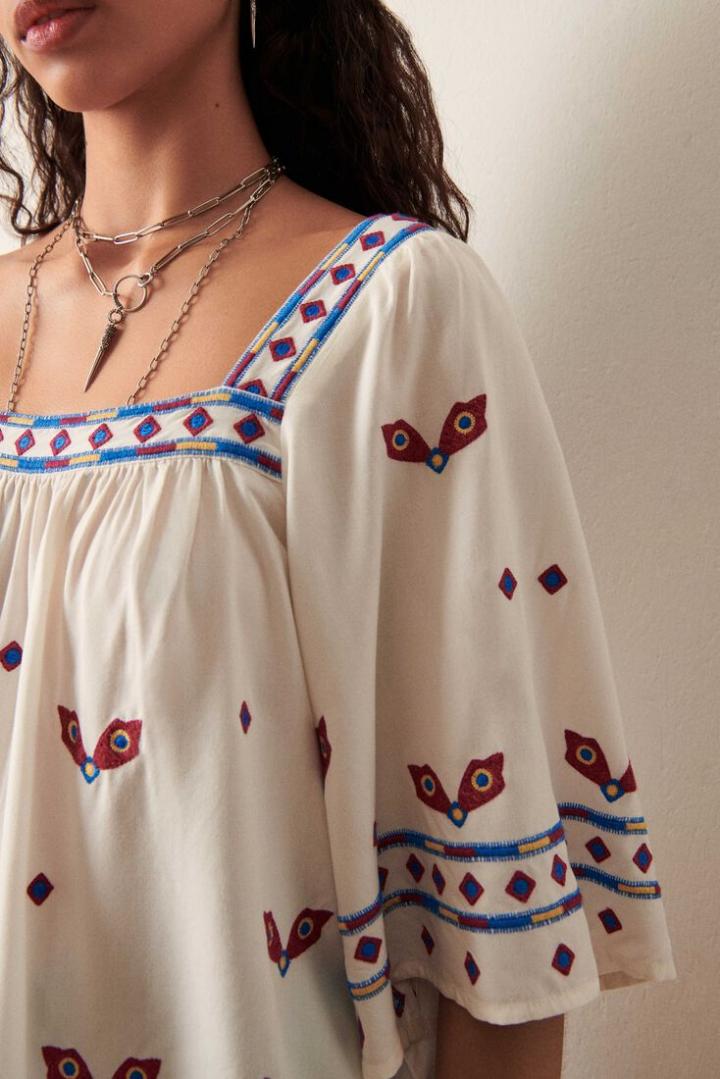 description La blouse JAY ba&sh se veut joyeuse et colorée. Cette blouse affiche une belle encolure carrée devant et au dos et dispose de manches courtes longueur au coude. Elle est confectionnée dans une matière fluide et légère, rehaussée de broderies placées sur l’ensemble du vêtement : une frise brodée souligne joliment l’encolure et le bas de corps et des manches. Une blouse brodée aux inspirations bohème très seventies.