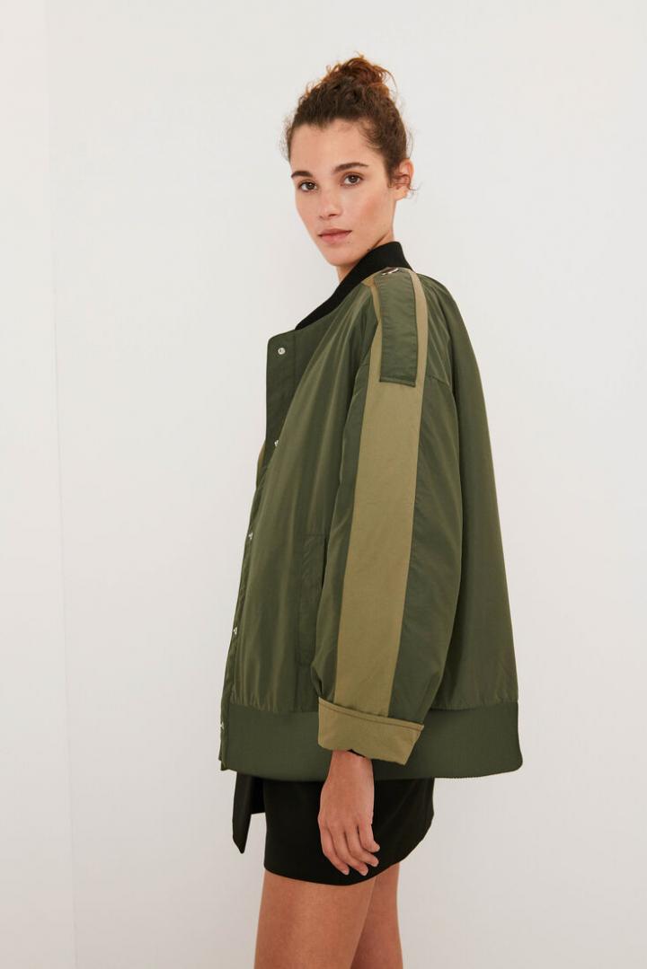description  Le blouson BRUCE ba&sh emprunte à la fois aux codes du trench et du bomber, pour une allure sport-chic. Adoptant une coupe oversize, ce blouson bicolore offre une silhouette sporty avec sa bande en coloris contrastant des épaules aux poignets. On note les bord-côtes au col et en bas de vêtement, les pattes de boutonnage aux épaules, les plis au dos qui lui confèrent un volume un peu boule, et la poche poitrine à passepoil contrastant. Un blouson très stylé, au look urbain féminisé.